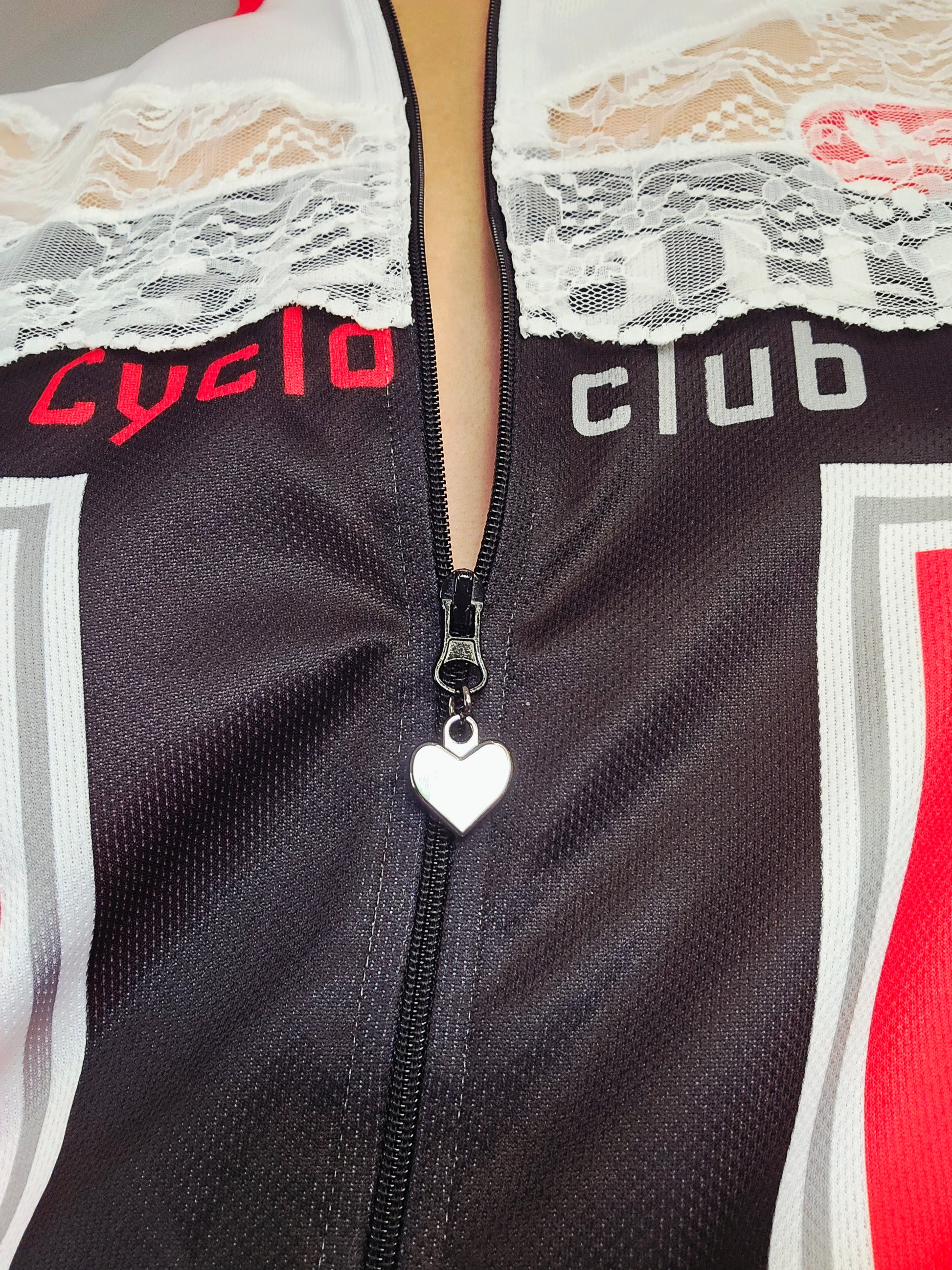 Métamorphose d'un maillot de cycliste pour lui donner un allure chic et sensuelle. Dentelle blanche et petit cœur en guise de curseur de fermeture éclair et bonjour le style unique !