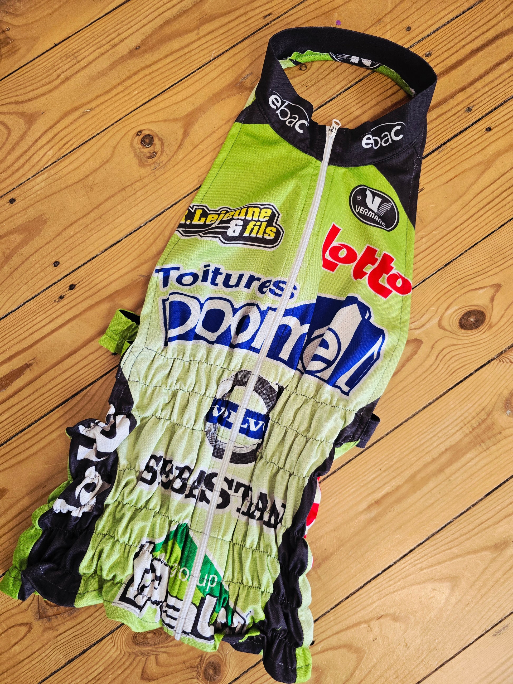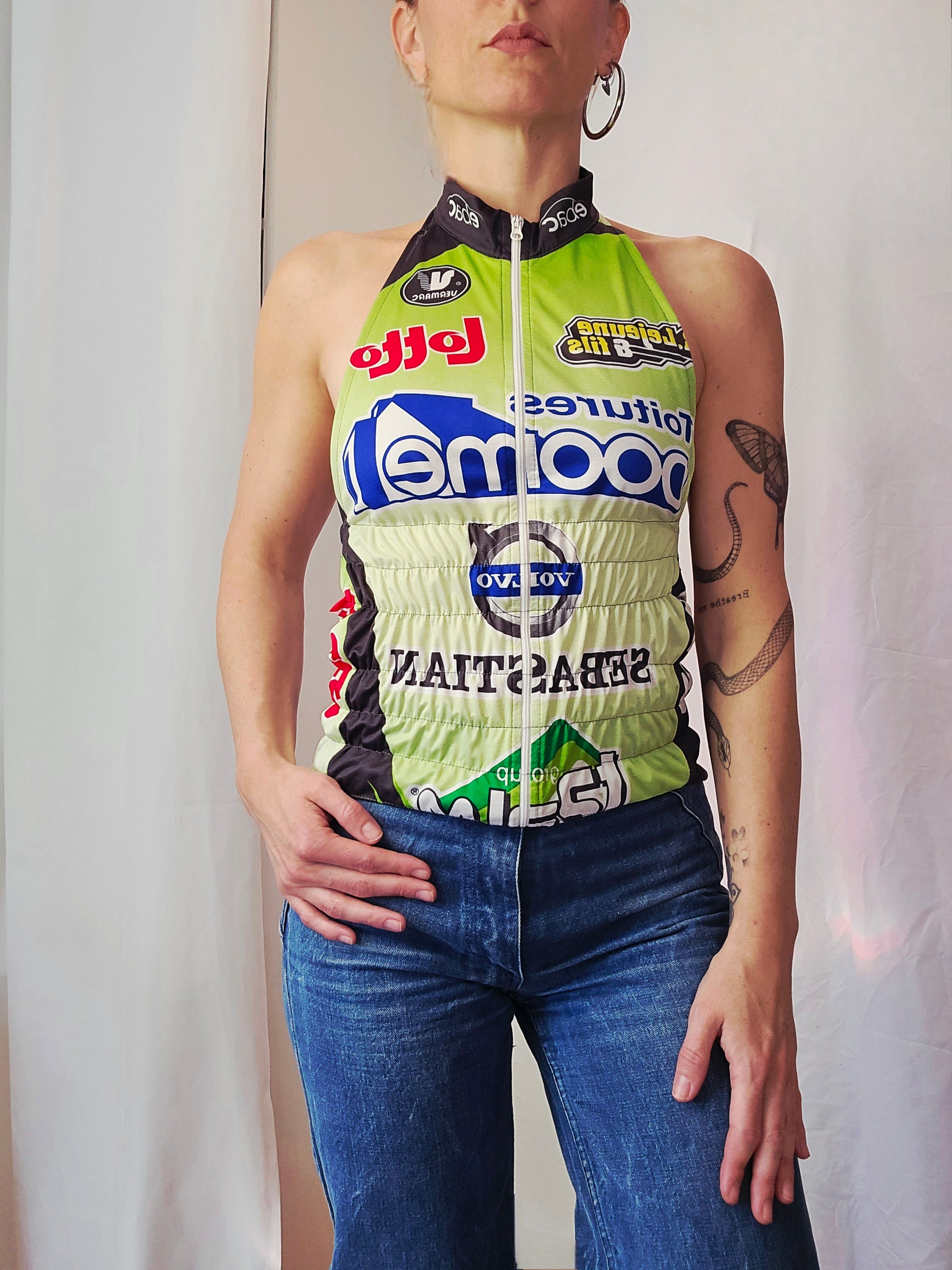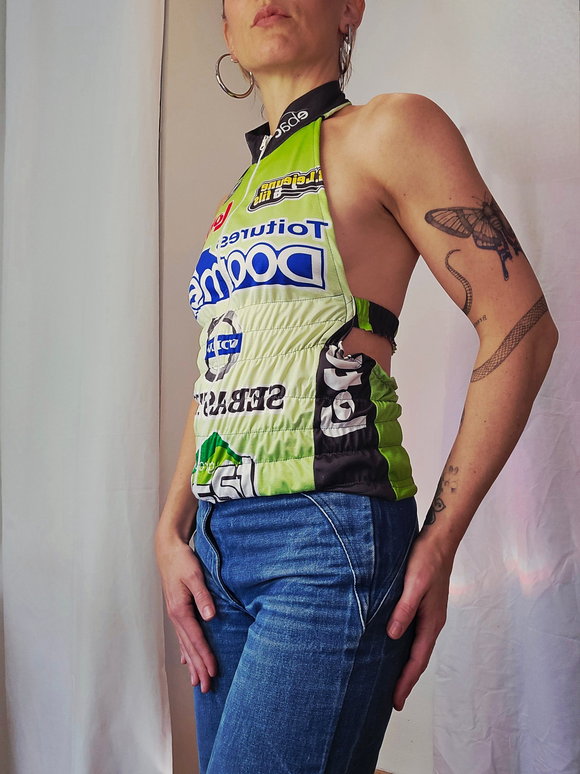 Maillot de cycliste complétement transformé en dos nu 90's paré de smocks et échancré sur les côtés. Comment passer inaperçue avec cette petite pépite ?