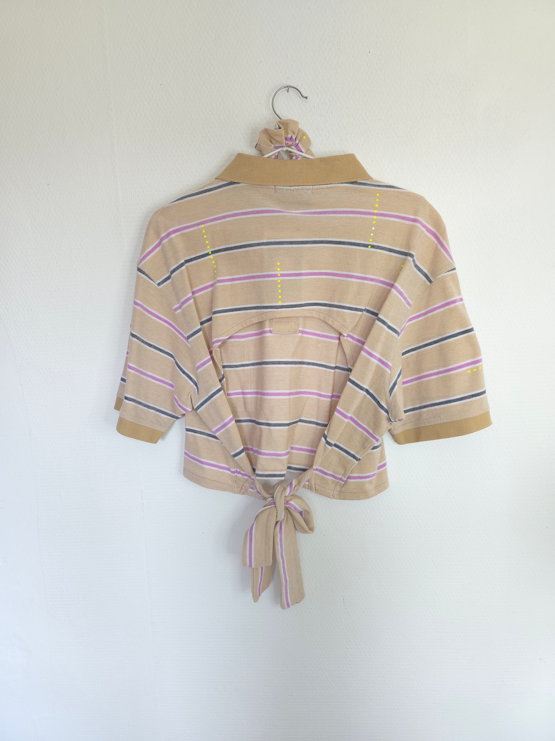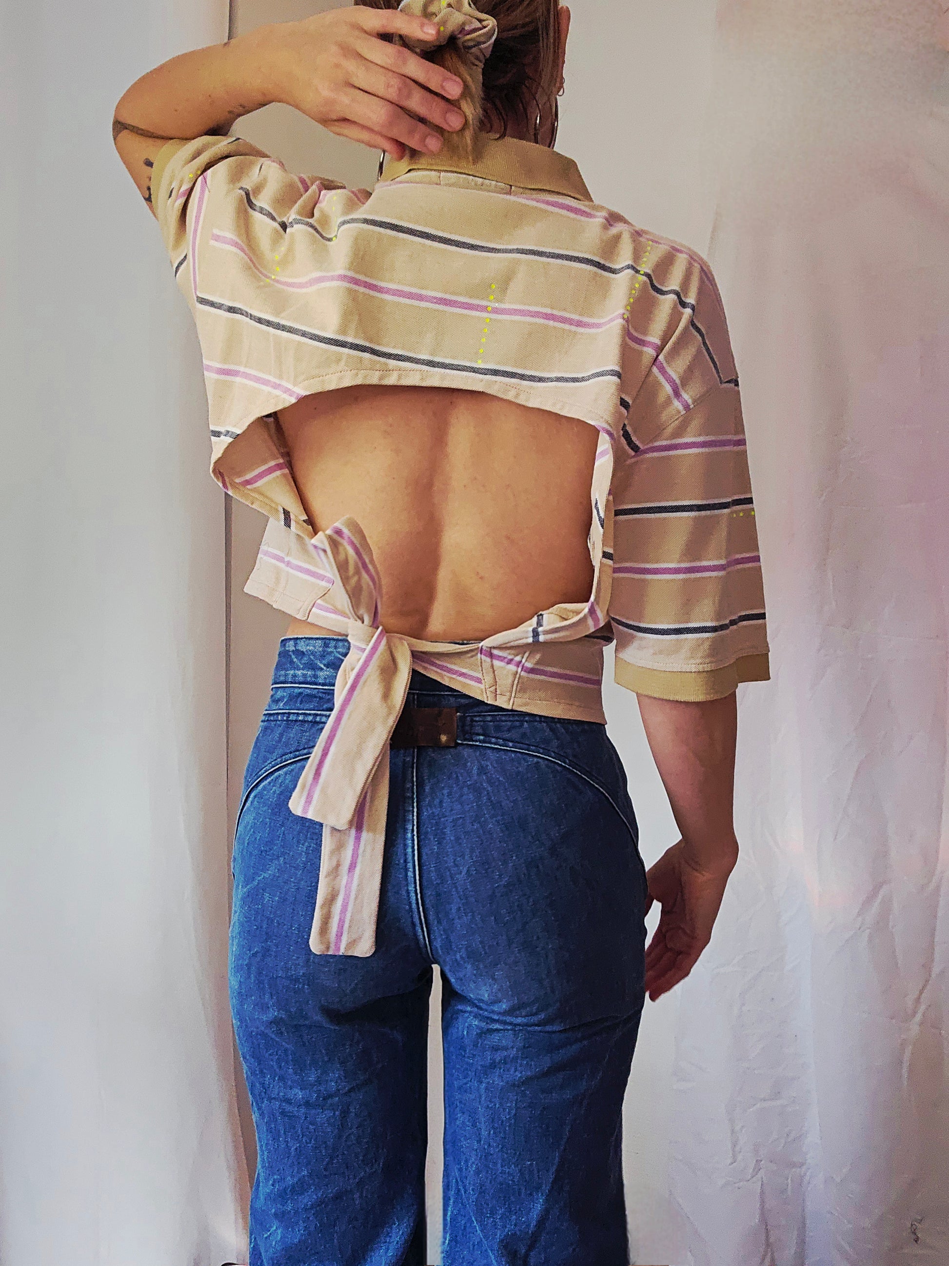 Ce polo revisité surprend par son twist audacieux : raccourci façon crop top à l'avant, il révèle un dos ouvert, à nouer selon l’envie, pour une silhouette ajustée et sensuelle. Une création qui joue entre confort et caractère, parfaite pour celles qui aiment se réinventer, jusque dans les détails.